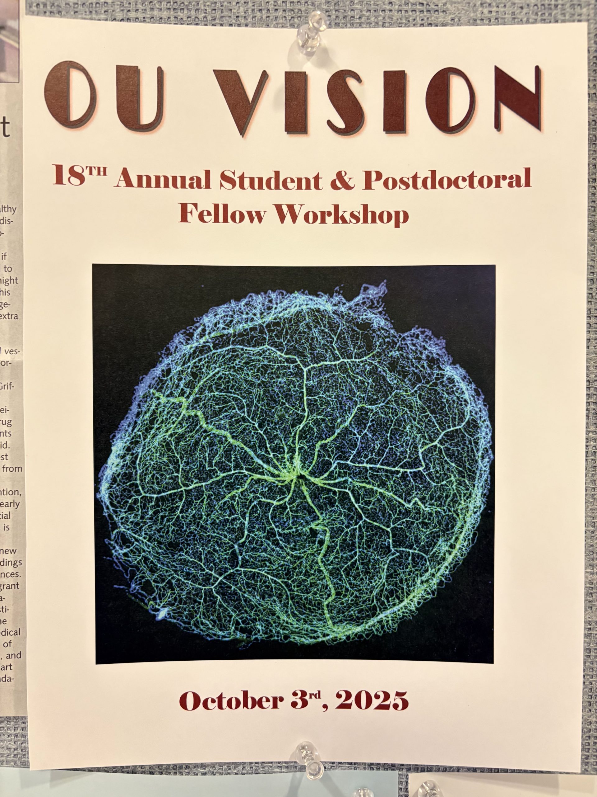 OU Vision Workshop Awards October 6, 2025 By griffinc Congrats to Eric for winning the Wei Cao Innovation Award at the 2025 OU Vision Workshop. Eric also won the Abstract Book Cover Photograph Award for his fabulous image of blood vessels in the mouse eye.
